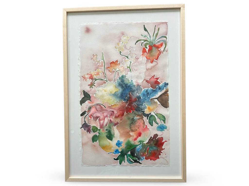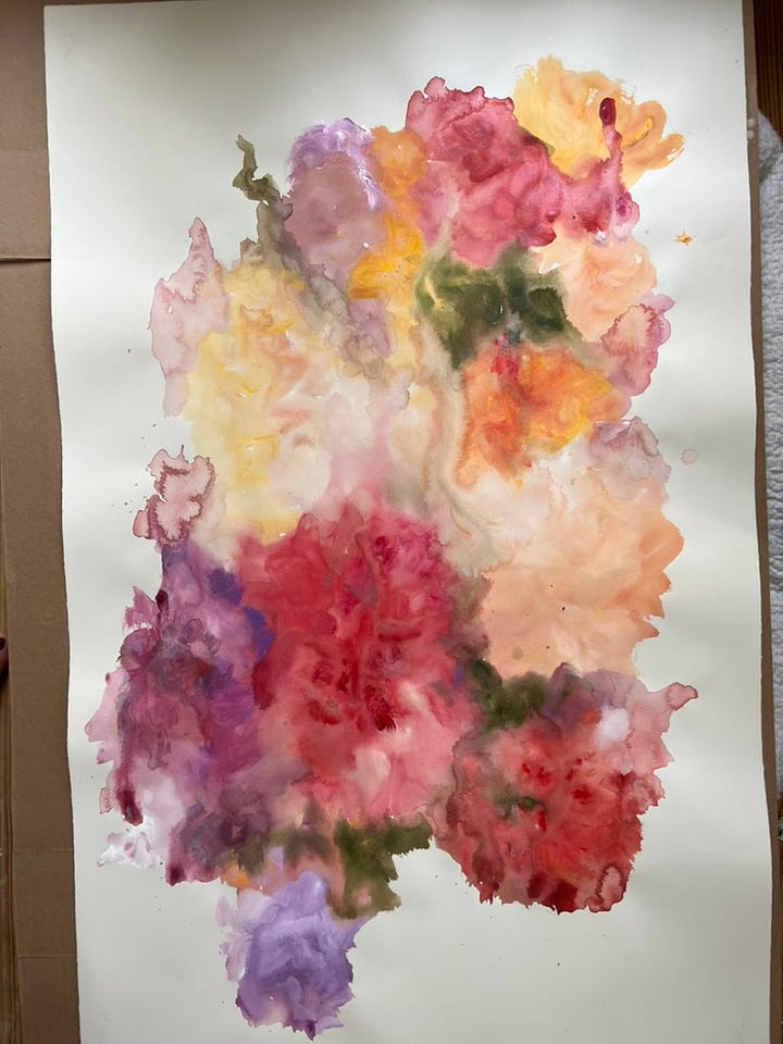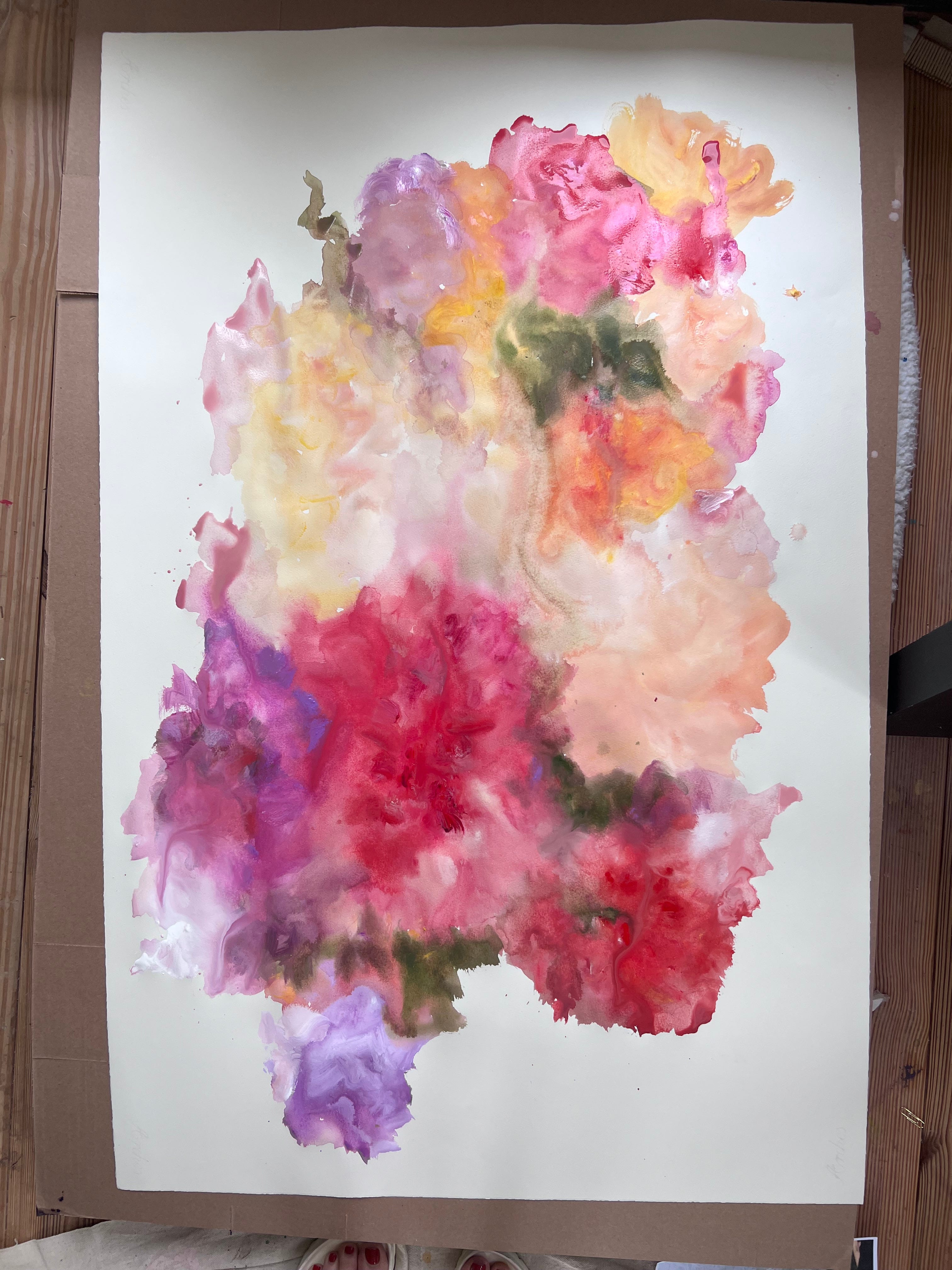 My latest inspiration is a blend of these abstract florals which almost don’t even look like florals, and the Flemish master’s paintings of supernaturally blooming paintings. I’m currently experimenting with looser forms and melty color blending while still working within a more formal composition.