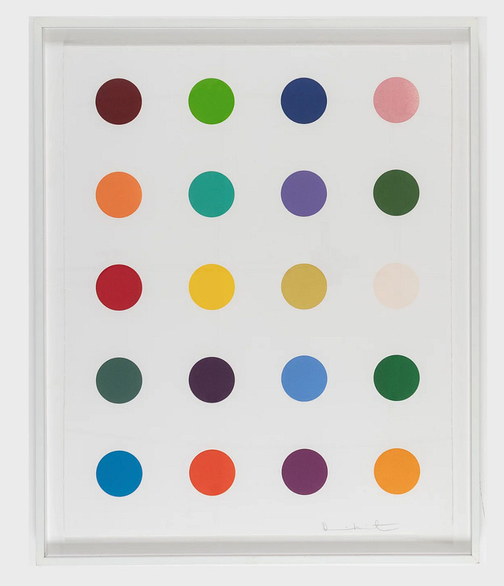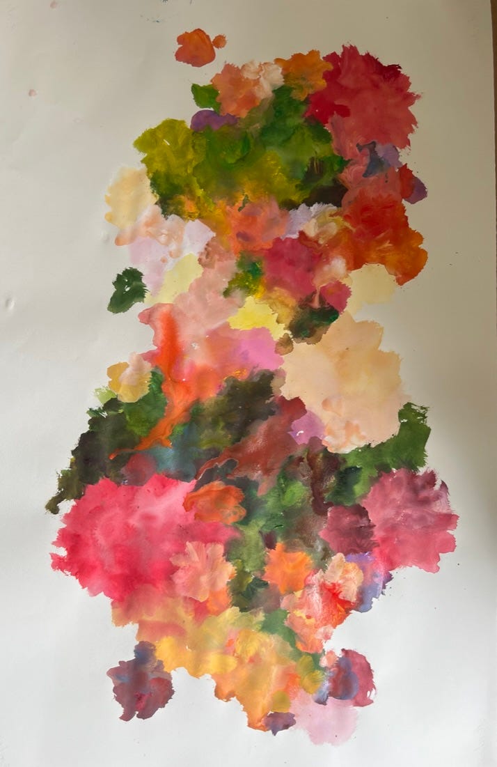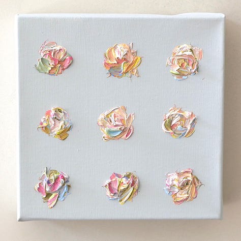 A lot of my inspiration comes from a mood and builds upon images I’ve seen. In Julia Cameron’s book The Artist’s Way, she refers to this as the bank, which needs to be constantly filled with more imagery as inspiration. For example, my dots series from 2022 are directly influenced by a friend mentioning Damien Hirst, which prompted me to research his works, see his spots, and shortly thereafter morphed my lollipop-like flowers into grids of color swirls.