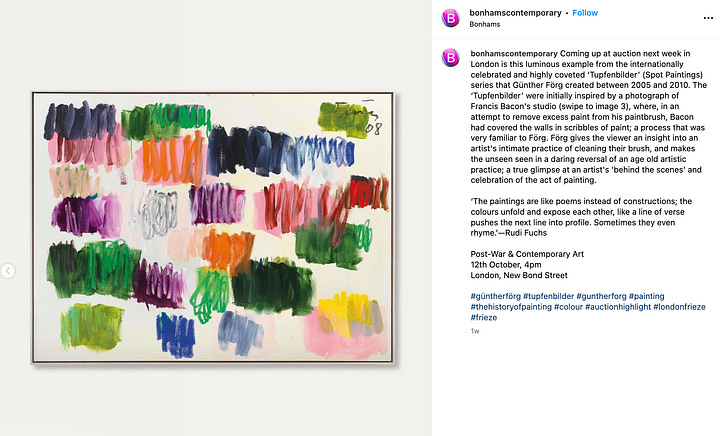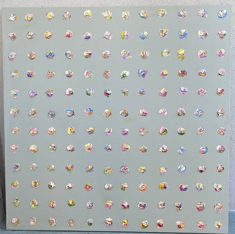 Similarly, a painting in the background of an instagram story caught my eye one day. I followed the link to the page for the gallery she tagged, tracked down previously tagged images until I found one where someone had tagged the artist, whose name is Günther Förg. Of course the artist doesn’t appear to have an instagram, but I found several more pieces of his. The colored scribbles, like a child testing out crayon colors, or an extremely pixelated meadow - I immediately thought of my dots, my “flowers”, and how I wanted to paint impressionistic, drippy swirly versions of them.
